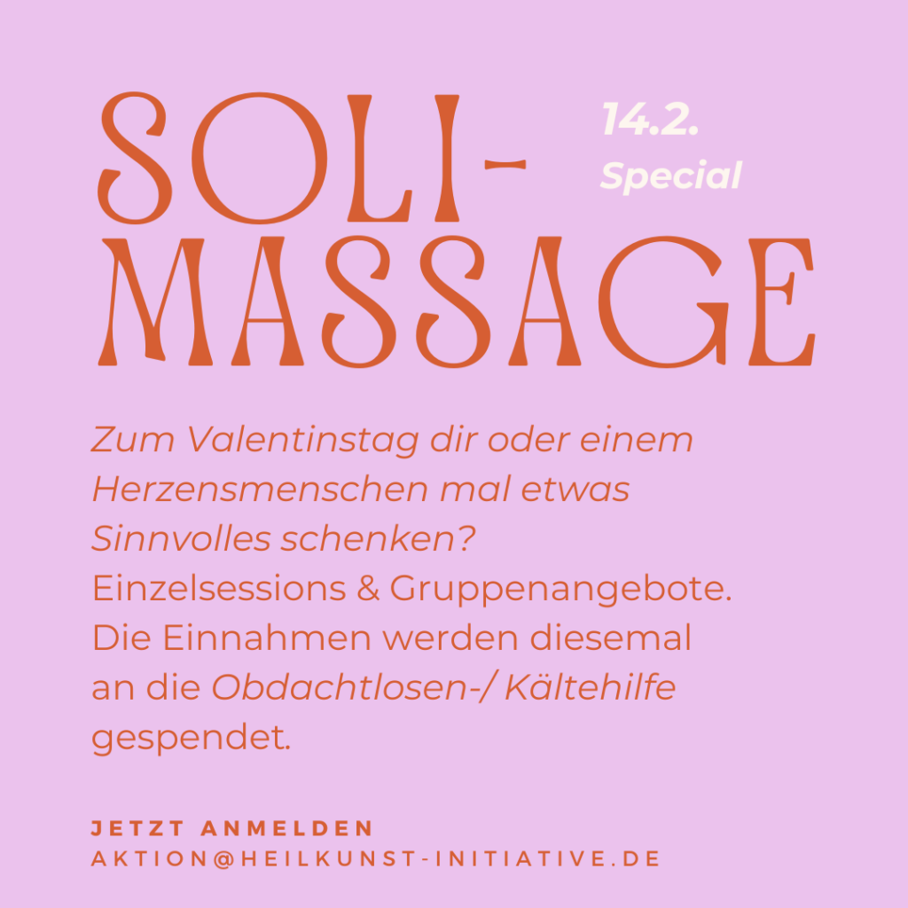 Einzelsessions: Thai-Massage, ThaiYoga-Massage, Ayurvedisch, Klassisch, Fußreflex,... Anmeldungen unter: aktion@heilkunst-initiative.de (wir senden Dir unsere Richtlinien dann per Email zu)