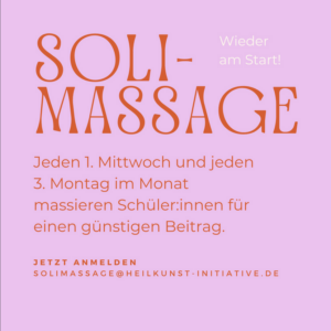 jeden 1. Mittwoch und jeden 3. Montag im Monat Shiatsu, klassische Massage, Fußreflex, Tuina, Thai-Yoga-Massage, Chi Nei Tsang, Ayurvedisch, Rücken, Nacken, Faszien, Anmeldung unter solimassage@heilkunst-initiative.de